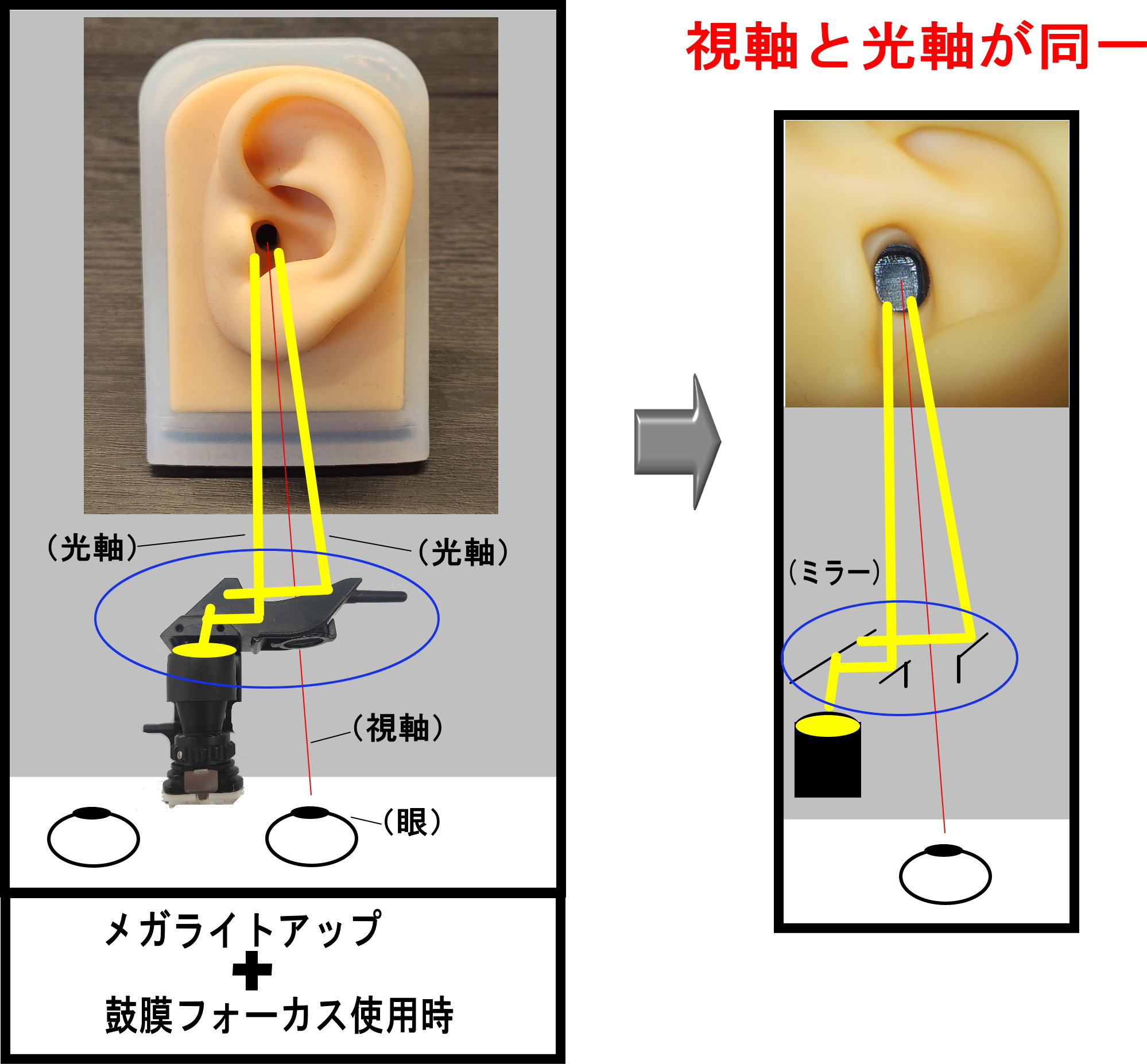 原理 :メガライトアップ中央の光をミラーで90°反射させ、更に覗き穴の左右に鼓膜に光が入るようにミラーを設定