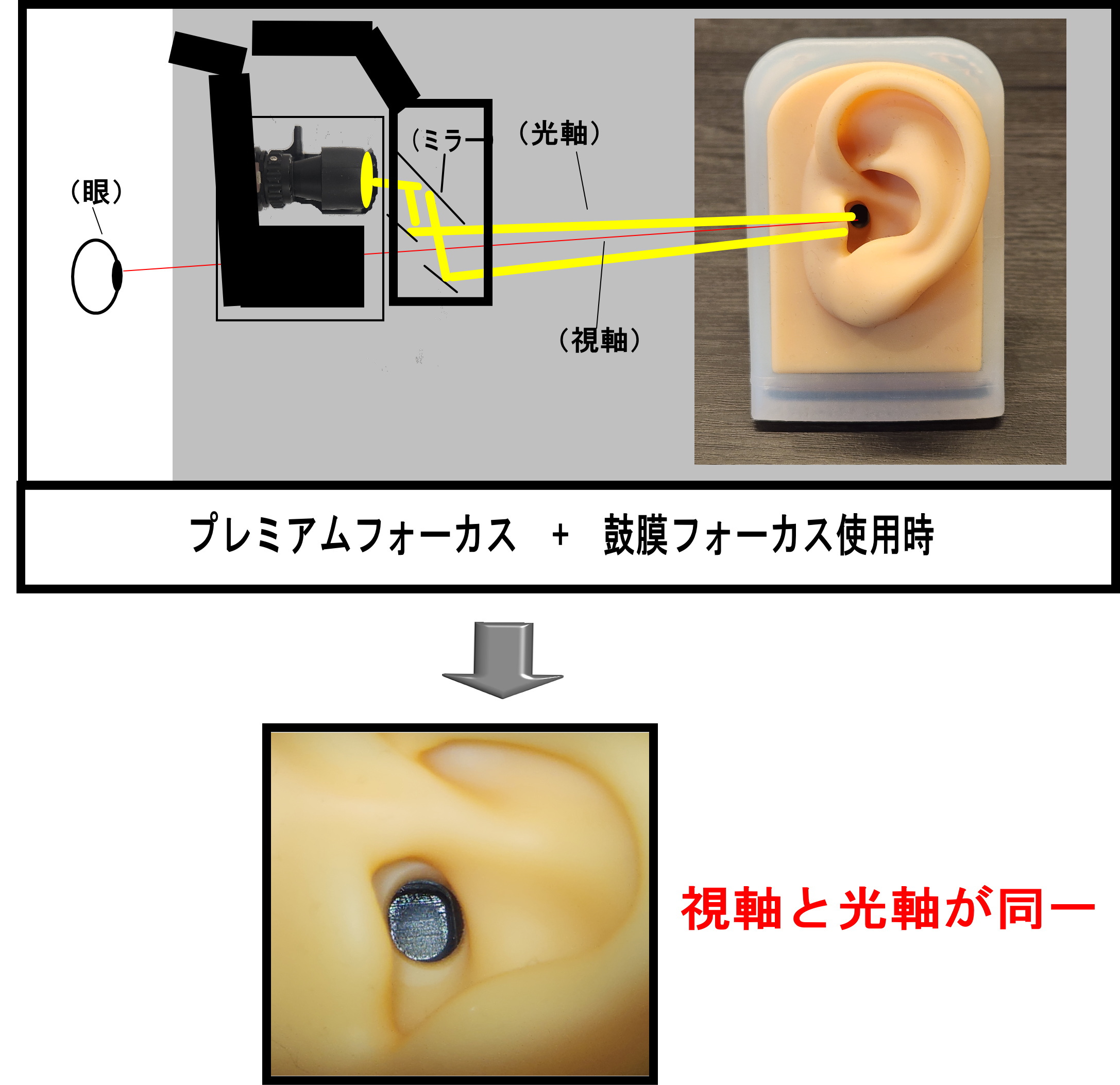 原理 :プレミアムフォーカス中央の光をミラーで90°下に反射させ、更に覗き穴の上下に鼓膜に光が入るようにミラーを設定
